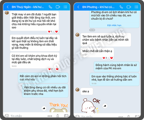 - Chị N.T.H (32 tuổi, TP. Bắc Ninh): “Trước đây mình thường ngại đi khám phụ khoa vì sợ phiền và không thoải mái. Nhưng từ khi đến Phòng khám Việt Sing, mình thấy rất yên tâm. Các bác sĩ nữ tư vấn nhẹ nhàng, cẩn thận và luôn hỏi han kỹ trước khi thăm khám. Không gian khám sạch sẽ, kín đáo, tạo cảm giác riêng tư. Sau khi kiểm tra, bác sĩ còn hướng dẫn cách vệ sinh đúng cách và hẹn lịch tái khám. Mình đánh giá cao sự tận tâm ở đây.”
