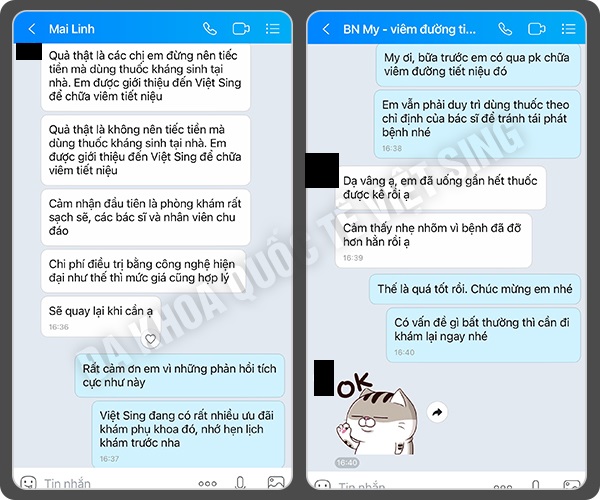 Nhiều chị em ghé tới phòng khám Đa khoa Quốc tế Việt Sing thăm khám và điều trị bệnh lý viêm đường tiết niệu cảm thấy hài lòng với kết quả chữa trị: