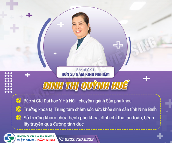 • Ngoài ra, phòng khám còn có Bác sĩ CKI Đinh Thị Quỳnh Huế với hơn 20 năm kinh nghiệm, bác sĩ Huế từng giữ chức vụ Trưởng khoa trung tâm chăm sóc sức khỏe “Bà mẹ và kế hoạch hóa” có tay nghề vững vàng trong chữa các bệnh viêm nhiễm phụ khoa, sùi mào gà,… với tỷ lệ thành công cao.