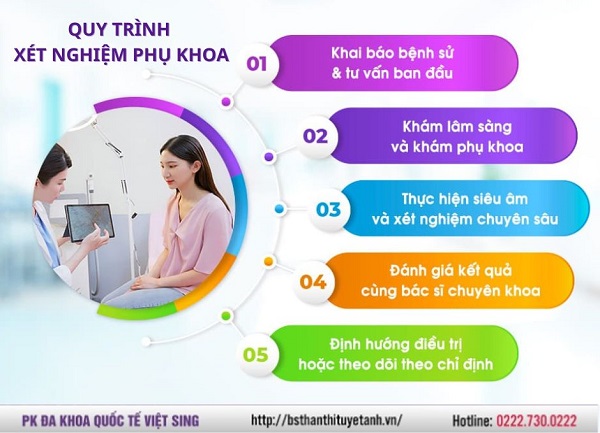 - Bước 1 – Thăm khám và tư vấn ban đầu: Bác sĩ trao đổi về tiền sử bệnh lý, chu kỳ kinh nguyệt, triệu chứng bất thường và nhu cầu kiểm tra của người bệnh.